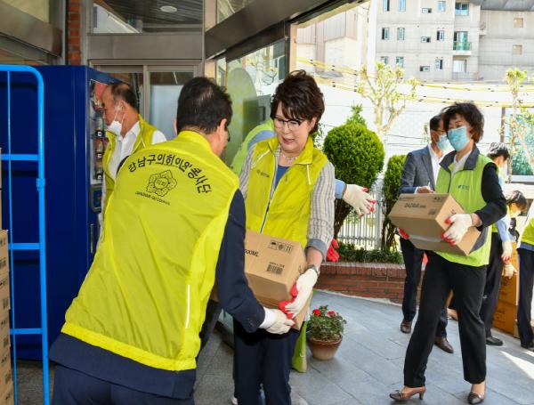 강남구의회(의장 이관수) 의원봉사단은 7일 관내 복지시설인 청음복지관, 하상장애인복지관, 강남세움 장애인통합지원센터를 차례로 방문하여 손세정제 등 후원물품을 전달했다.