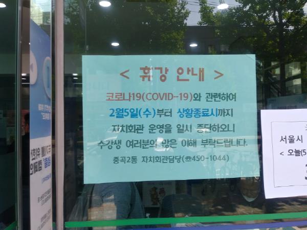 김선갑 구청장은 “자치회관 프로그램 운영의 중요한 역할을 맡고 있는 강사들이 코로나19로 인해 경제적 어려움을 겪지 않도록 하기 위해 강사료 우선 지급을 결정하게 됐다”며 “하루 빨리 코로나19를 이겨내고 자치회관이 다시 활기를 찾을 수 있도록 더욱 최선을 다하겠다”고 말했다.