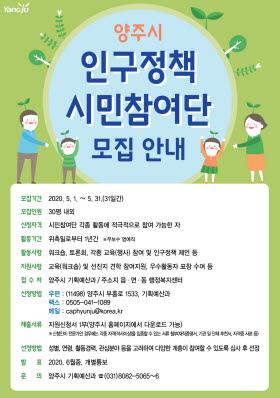 양주시(시장 이성호)는 오는 31일까지 저출산 극복을 위한 ‘양주시 인구정책 시민참여단’을 모집한다고 밝혔다.