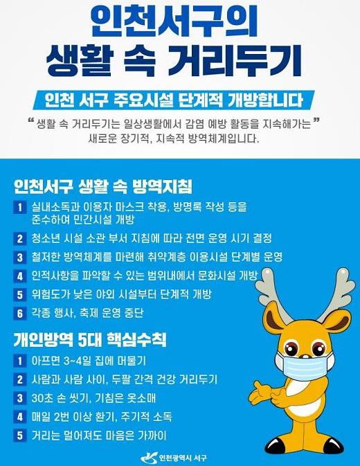 정부 및 인천시 지침과 연계해 서구는 지역 환경에 적합한 생활 속 거리두기 방침을 마련하고 6일부터 실행에 옮기기로 했다. 특히 재유행 가능성을 항상 염두에 두고 이전보다 한층 철저한 방역 및 관리를 병행해갈 방침이다.