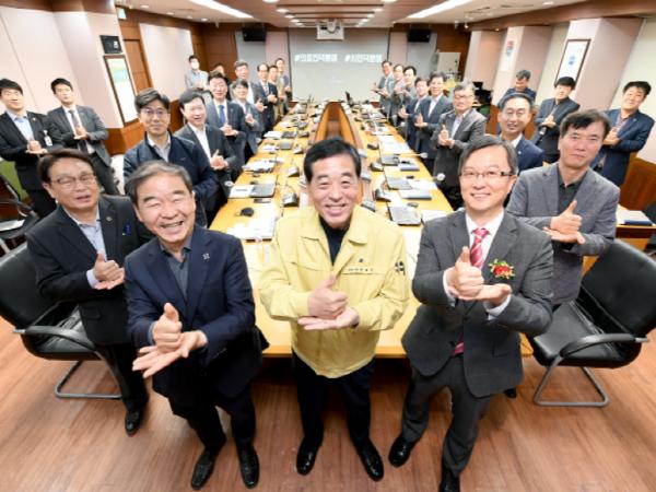 윤 시장은 8일 오전 시청에서 열린 주간정책회의 시작에 앞서 회의에 참석한 간부 공직자들과 ‘덕분에 챌린지’를 함께했다.