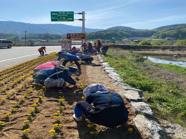 침체된 면민들의 마음에 봄기운을 선사할 연도변 꽃길이 생활개선회의 구슬땀으로 완성되었다.