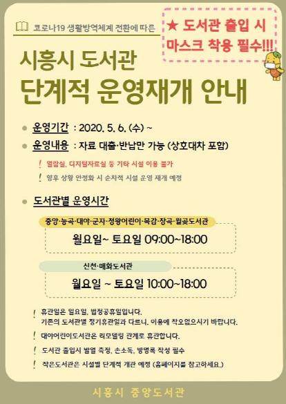 시흥시중앙도서관(관장 김경남)은 5월 6일부터 코로나19 확산 방지를 위해 임시휴관 중이었던 공공도서관 문을 열고 자료 대출?반납 서비스를 재개했다.