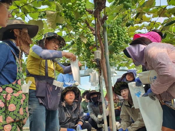 이번 봉사활동의 대강면의 포도농가로 1월가온농가는 지금 봉지씌우기와 알솎기를 해야 하는데 일손이 많이 부족한 것이 현실이다. 농업기술센터 직원 30여명이 포도농가 생육기에따른 간단한 이론교육도 받고, 봉지씌우기를 직접하면서 농촌의 일손도 돕고 지도능력또한 배양하는 뜻깊은 시간이 되었다.