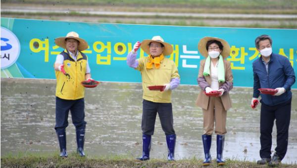 여수시는 8일 소라면 대곡마을 친환경유기벼단지에서 풍년농사를 기원하는 올해 첫 모내기 행사를 가졌다.