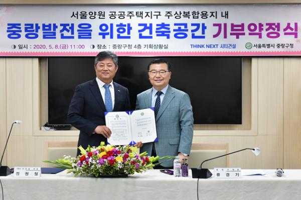 중랑구(구청장 류경기)가 8일 오전 11시 구청 기획상황실에서 ㈜시티건설(㈜시티해양건설(회장 정원철))과 중랑발전을 위한 건축공간 기부약정식을 개최했다고 밝혔다.