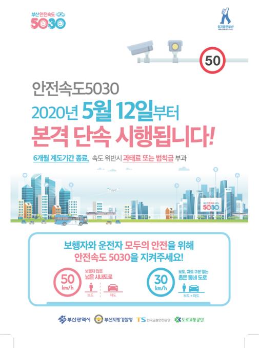 부산광역시와 부산지방경찰청은 교통사고 사망자 감소 및 보행자 교통안전 강화를 위해 지난해 11월 11일부터 부산 도심 전역에 전국 최초로 시행 중인 ’안전속도 5030‘의 계도기간 운영을 마치고, 5월 12일 0시를 기점으로 본격 단속을 시행한다고 밝혔다.