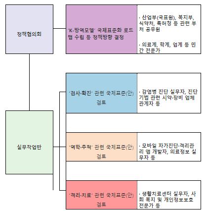 제1차 ‘정책협의회’에서는 선별진료소 운영절차, 생활치료센터 운영 표준모형 등 18종의 'K-방역모델' 국제표준화를 추진하기 위한 로드맵(안)에 대한 의견을 수렴하였고, 각 분야별로 필요한 국제표준(안)을 구체화하여 ISO 등 국제표준화기구에 순차적으로 제안할 계획이다.