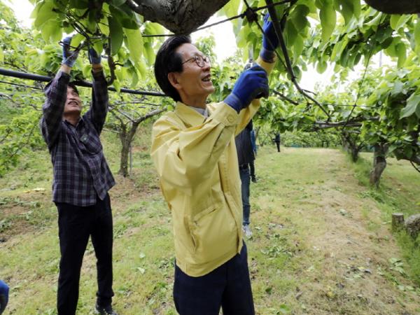 11일 고창군에 따르면 지난 9일 유기상 고창군수와 군청 직원들이 고창읍 호동마을을 찾아 배 솎아주기 작업에 힘을 보탰다.