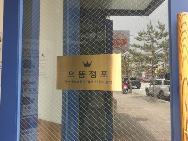 군은 으뜸점포 이용을 적극 지원하기 위해 ‘괴산사랑상품권 결제 시 5% 할인’이라고 적힌 안내간판을 제작해 모든 으뜸점포에 부착했다.