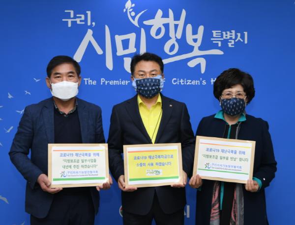한편 구리지속가능발전협의회 안승남 구리시장, 임순빈 공동의장과 협의회 임원 및 운영위원회 위원들은 코로나19 경제 위기 극복을 위해 추진되는 경기도 재난기본소득의 도민 신청이 오는 9일부터 1인당 10만원씩 지급됨에 따라 이 기금도 위기를 기회로 만드는 새로운 활력이 될 수 있도록 전액 시에 기부하는 기부운동을 펼치고 이를 범시민 운동으로 확대 전개될 수 있도록 기부 챌린지를 펼칠 예정이다.