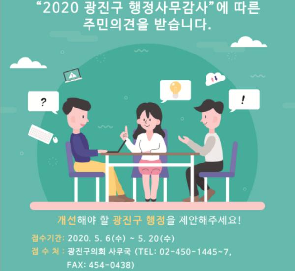 광진구의회(의장 고양석)가 2020년도 행정사무감사(6월4일~6월12일)를 앞두고 구 행정 발전에 밑거름이 될 수 있는 주민의견을 받는다.