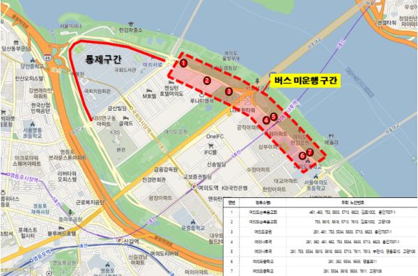 특히, 주말기간(4.4~4.5) 여의도 윤중로 인근 버스 정류소 7개소를 폐쇄하고, 해당 정류소에 정차하는 17개 노선을 우회 운행한다.