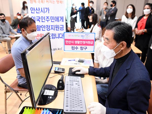 윤화섭 안산시장은 외국인 주민을 대상으로 생활안정지원금 현장 접수가 시작된 지난 11일 접수창구를 찾아 “불편을 최소화하고, 신속히 지원되도록 노력하겠다”고 말했다.
