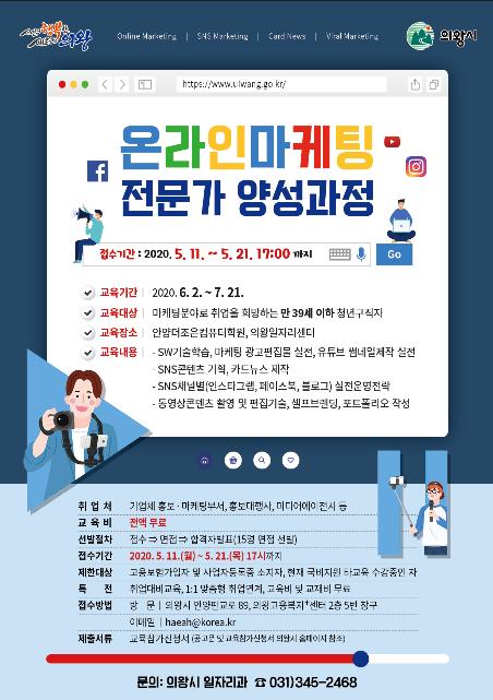 의왕시(시장 김상돈)는 온라인마케팅에 관심 있는 청년들의 취업을 지원하기 위한 ‘온라인마케팅 전문가 양성과정’을 오는 6월 2일부터 7월 21일까지 진행한다.