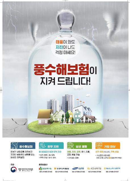 풍수해보험은 태풍, 호우, 강풍 등 예기치 못한 자연재난으로 발생한 피해를 실질적으로 보상하도록 만든 정책보험제도로, 자연재난에 의한 사유재산 피해 지원제도의 한계점인 지원 금액과 시기 등을 보완했다.