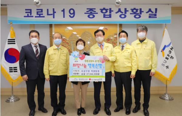대구 수성구는 코로나19 위기극복을 위해 6급 이상 직원들이 모은 성금 27,544,330원을 사회복지공동모금회 대구지회에 지난 1일 전달했다.