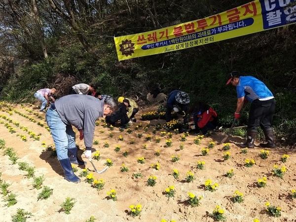 삼계면 새마을협의회(회장 김수열)와 새마을부녀회(회장 김행순)는 불법 투기된 쓰레기를 분류?처리하고, 화산리 오 모씨는 꽃밭 조성에 필요한 흙을 제공했다. 사창리 주민 김 모씨는 자신의 굴착기를 사용해 흙 다지기를 도왔으며, 인근 마을 이장들과 주민, 삼계면 공무원은 매리골드를 식재해 화단을 완성했다.