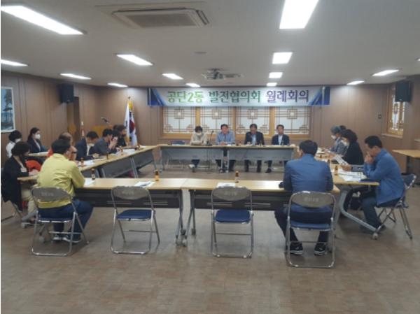 경상북도 구미시 공단2동(동장 박진상)에서는 5. 11(월) 18:30 동행정복지센터 2층 회의실에서 공단2동 발전협의회(회장 이정욱) 회원 20여명이 참석한 가운데 5월 월례회의를 개최하였다.
