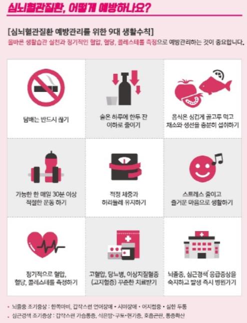 특히, 고혈압과 심뇌혈관질환 예방을 위해서는 절주와 금연, 충분한 채소, 생선 섭취, 저지방, 저염식, 적정 체중 유지, 매일 30분 이상 운동, 스트레스 관리 등 올바른 생활습관 실천이 중요하다.
