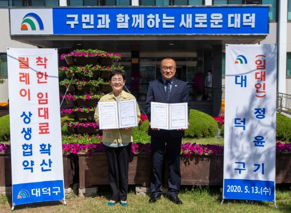 대전 대덕구(구청장 박정현)가 13일 구청에서 코로나19로 인한 소상공인 고통분담을 위해 신탄진동에 거주하는 정윤기 씨와 착한 임대료 확산 릴레이 상생협약을 맺었다.