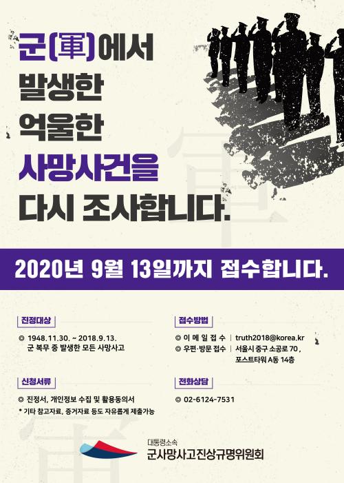 진정접수 대상은 사망원인이 명확하지 않다고 의심되는 군의문사 뿐만 아니라 사고사, 병사, 자해사망(자살) 등 군대에서 발생한 모든 유형의 사망사고를 포괄한다.