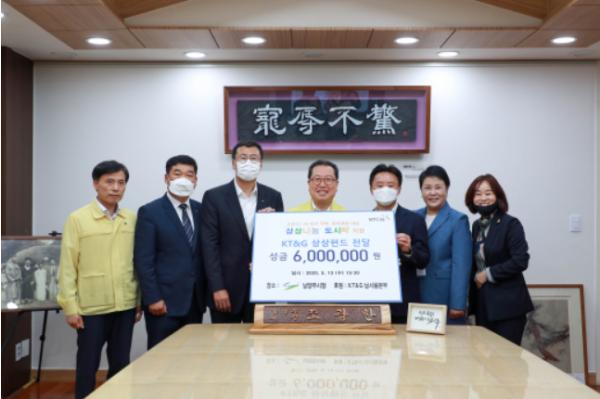 KT&G 남서울본부(본부장 박성식)은 13일 시장 집무실에서 남양주시의 코로나19 위기 극복과 취약계층 지원을 위해 KT&G 상상펀드로 조성된 성금 600백만원을 동부희망케어센터에 기탁했다.