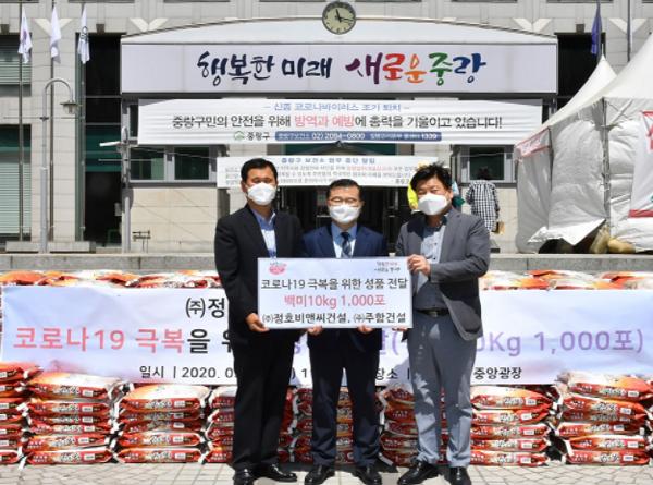 중랑구(구청장 류경기)는 13일 ㈜정호비앤씨건설, ㈜주함건설로부터 코로나19 극복을 위해 써달라며 10kg 백미 1,000포를 기탁 받았다고 전했다.