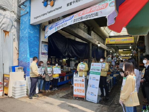 이날은 중앙전통시장 상인회, 통영시 시의원, 공무원 등 20여 명이 3개조로 나뉘어 중앙전통시장 내 모든 상인들에게 마스크 착용 생활화를 홍보했다.
