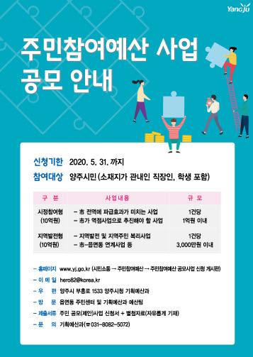 양주시(시장 이성호)는 코로나19 위기 극복을 위한 시민들의 많은 의견 등을 적극 청취하기 위해 2020년 주민참여예산 시민제안사업 공모기간을 오는 5월 31일까지 연장한다.