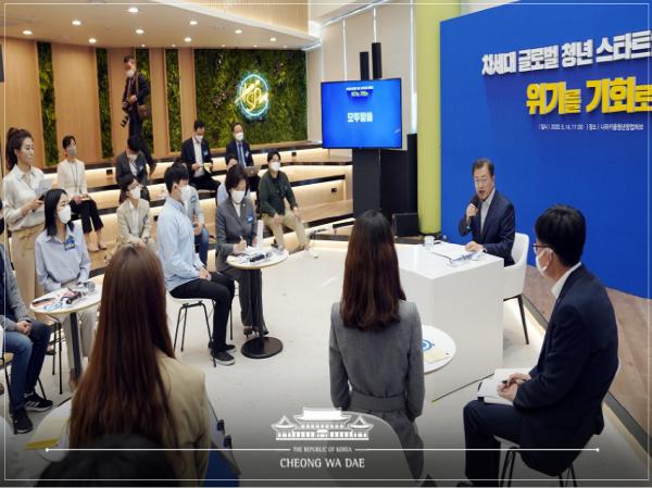 문재인 대통령은 간담회에 참석해 위기를 기회로 삼아 글로벌 리더로 성장하고 있는 청년 스타트업 기업인들을 만나 격려하고 현장의 목소리를 들었다.