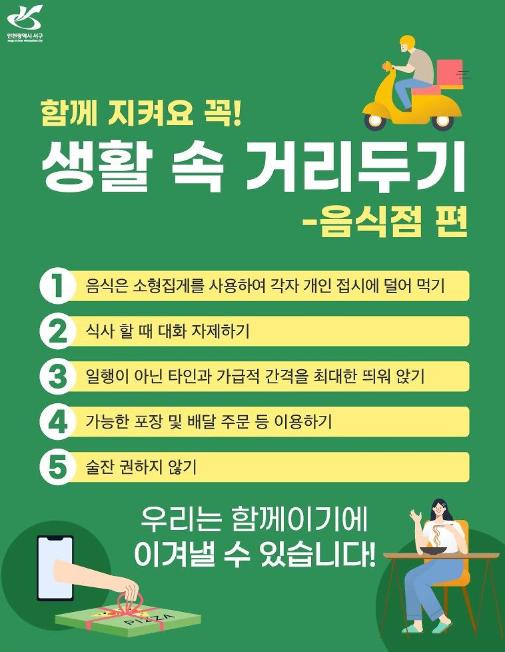 생활방역 지침안내 사항으로 음식점 이용자에게는 ▲음식은 소형집게를 사용하여 각자 개인접시에 덜어먹기, ▲식사를 할 때는 대화를 자제하기, ▲가능한 포장 및 배달주문 등 이용하기, ▲ 술잔 권하지 않기 등을 안내했다.