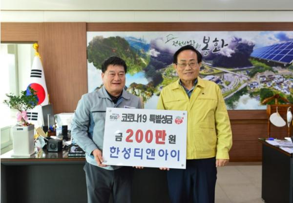 봉화군 한성티앤아이(대표 정윤상)는 3월 31일(화) 봉화군청을 방문하여 코로나19 극복을 위한 특별성금 각각 200만원을 기탁했다.