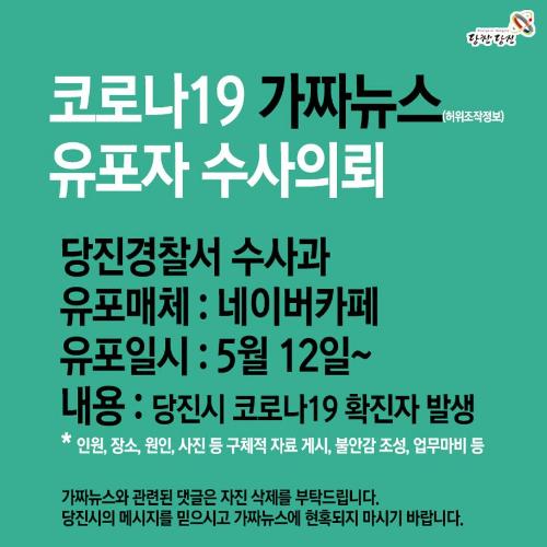 당진시는 코로나19 허위조작정보 유포 건에 대해 13일 경찰서에 수사의뢰하고, 가짜뉴스 확산 차단에 대한 강력한 조치에 나섰다.