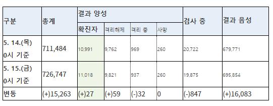 질병관리본부 중앙방역대책본부(본부장 정은경)는 5월 15일 0시 현재, 신규 확진자가 27명 발생하여 총 누적 확진자수는 11,018명(해외유입 1,150명(내국인 89.8%))이라고 밝혔다.