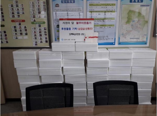 지난 14일 만수2동 행정복지센터(동장 권오극)에는 얼굴없는 기부천사가 후원물품[삼겹살(2kg 50박스), 문화상품권(25만원) : 총 165만원 상당]을 기탁했다.