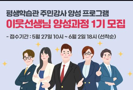 ‘이웃선생님 양성과정’은 6월 16일부터 8월 6일까지 8주간 진행되며 ▲강의안 만들기 ▲강의기법 ▲보이스 트레이닝 등 기초 강의뿐 아니라 8주차에는 수강생이 직접 강의진행 후 피드백을 받는 실습 과정도 마련되어 있다.