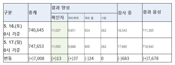 질병관리본부 중앙방역대책본부(본부장 정은경)는 5월 17일 0시 현재, 신규 확진자가 13명 발생하여 총 누적 확진자수는 11,050명(해외유입 1,167명(내국인 89.2%))이라고 밝혔다. 신규 격리해제자는 37명으로 총 9,888명(89.5%)이 격리해제 되어, 현재 900명이 격리 중이다.