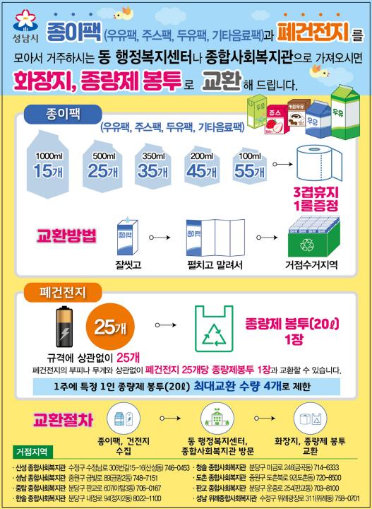 성남시는 일정량의 폐건전지나 종이팩을 모아 동 행정복지센터로 가져오면 각각 종량제 봉투, 화장지로 교환해주는 ‘재활용품 보상 교환사업’을 편다고 5월 18일 밝혔다.