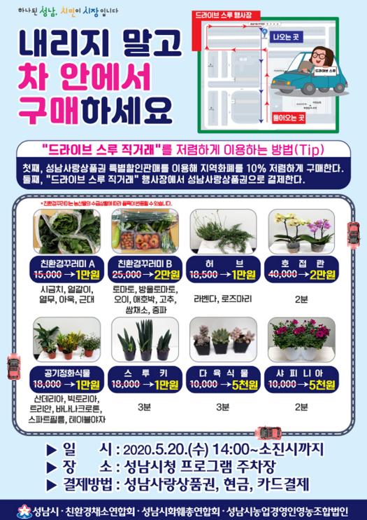 성남시는 코로나19 장기화로 위축된 농산물과 화훼류 소비촉진을 위해 5월 20일 오후 2시 시청 야외주차장에서 ‘드라이브 스루 직거래 판매 행사’를 연다.