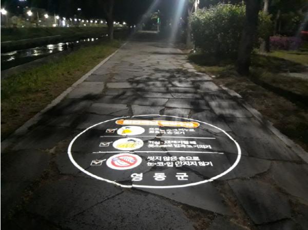 군은 최근 영동읍 용두교부터 매천교까지 이르는 0.7km 구간과 용두제2공원 등 군민들의 통행이 많은 이 길에 코로나19 예방수칙을 강조하는 50w 이미지빔 8개를 설치했다.