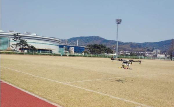 김천시(시장 김충섭)는 지난 5월 김천종합스포츠타운 내 천연잔디 축구장에서 여름철 최적의 천연잔디 생육환경과 그라운드 위 선수들의 안전을 위해 드론을 활용한 친환경 항공방제를 실시했다.