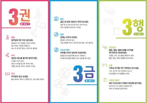 주요 내용은 △3권(즐길 것) 운동·식사·독서 즐기기 △3금(참을 것) 술·흡연은 줄이고, 머리를 다치지 않게 조심하기 △3행(챙길 것) 건강검진, 치매 조기발견, 가족?친구들과의 소통 챙기기 등이다.