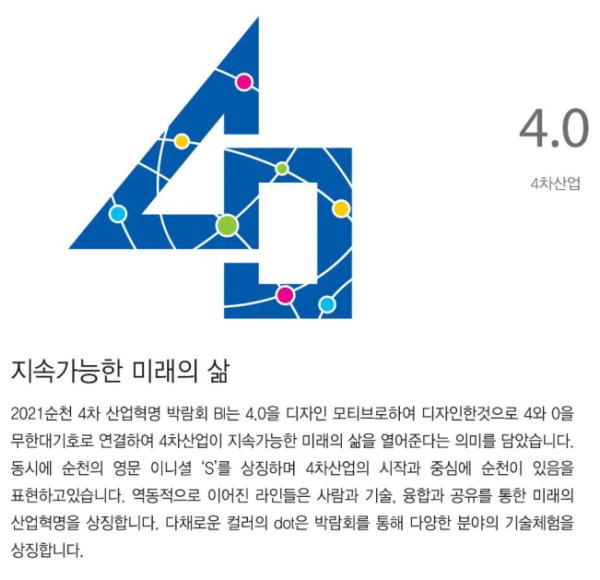 연결된 4와 0은 4차산업혁명과 동시에 순천의 영문 이니셜인 ‘S’를 상징하며, 4차산업혁명의 중심에 순천이 있음을 표현했다. 역동적으로 이어진 선은 사람과 기술, 융합과 공유의 미래를 상징하고, 다채로운 색상의 점들은 박람회에서 다양한 분야의 기술과 체험을 펼쳐질 것을 표현한 것이다.