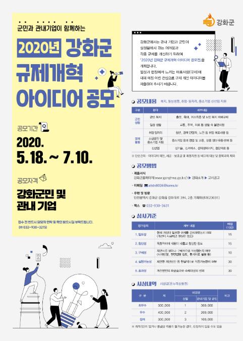 강화군은 기업 활동에 걸림돌이 되거나 생활에 불편을 주는 불합리한 규제를 군민과 함께 발굴하고 개선하기 위해 ‘2020년 강화군 규제개혁 아이디어 공모’를 오는 7월 15일까지 접수한다.