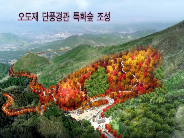 지난해부터 조성하고 있는 오도재 단풍경관 특화숲은 국유림 포함 57ha에 3만여본의 단풍나무 외 6종의 특색있는 단풍나무류를 식재하여 지리산과 더불어 함양미래의 100년을 내다보는 대표적인 명소를 만들어 함양의 관광인프라를 더욱 확충한다는 계획이다.