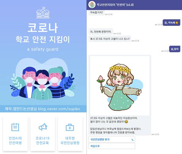 이 앱은 코로나19에 관한 전반적인 정보와 자가점검기능, 집단생활시 학생들이 지키기 힘든 예방수칙 등을 친구와 대화하듯 채팅창을 통해 알기 쉽게 제공하는 챗봇(채팅 로봇)과 위급상황 또는 감염의심상황에 국민안심병원의 위치와 연락처, 홈페이지를 즉시 찾을 수 있는 국민안심병원 찾기로 이루어져 있다.