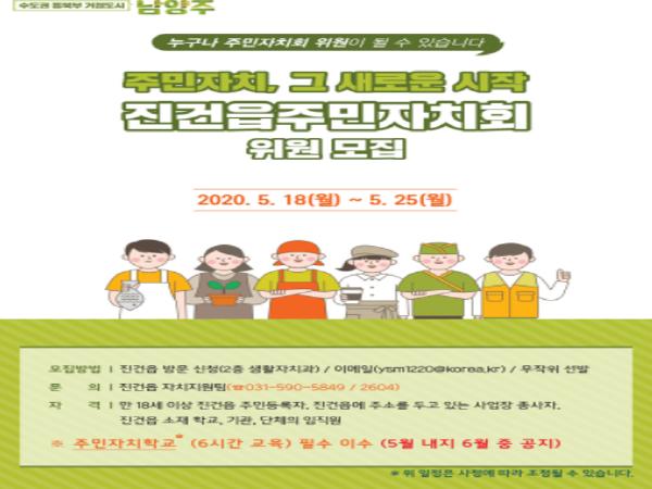 한편, 『제1기 진건읍 주민자치회』 위원 구성인원은 최대 30명이며, 공개모집기간은 5. 18(월) ~ 5. 25(월)로 방문접수(진건읍사무소 2층 자치지원팀, 문의전화 590-5849/2604), 이메일 접수(접수마감일 18시 도착분에 한함)로 가능하다. 무작위 선발은 용역으로 별도로 진행할 예정이다.