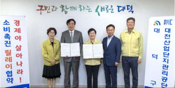 대전 대덕구(구청장 박정현)가 19일 구청에서 코로나19 영향으로 인한 경기침체 극복을 위해 대전산업단지관리공단(이사장 김종민)과 ‘경제야 살아나라!’ 소비촉진 릴레이 협약을 맺었다.