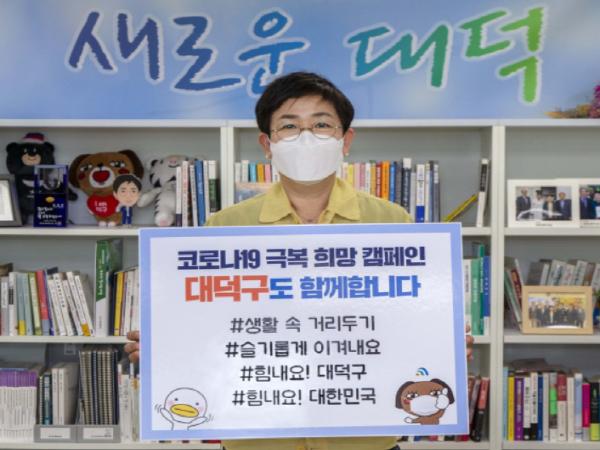 희망캠페인은 코로나19로 어려움을 겪고 있는 국민과 의료진에게 응원과 감사의 마음을 전달하기 위해 시작된 것으로, 이날 박 청장은 ‘#슬기롭게 이겨내요 #힘내요! 대덕구 #힘내요! 대한민국’이라는 응원 메시지를 전달하며 캠페인에 동참했다.